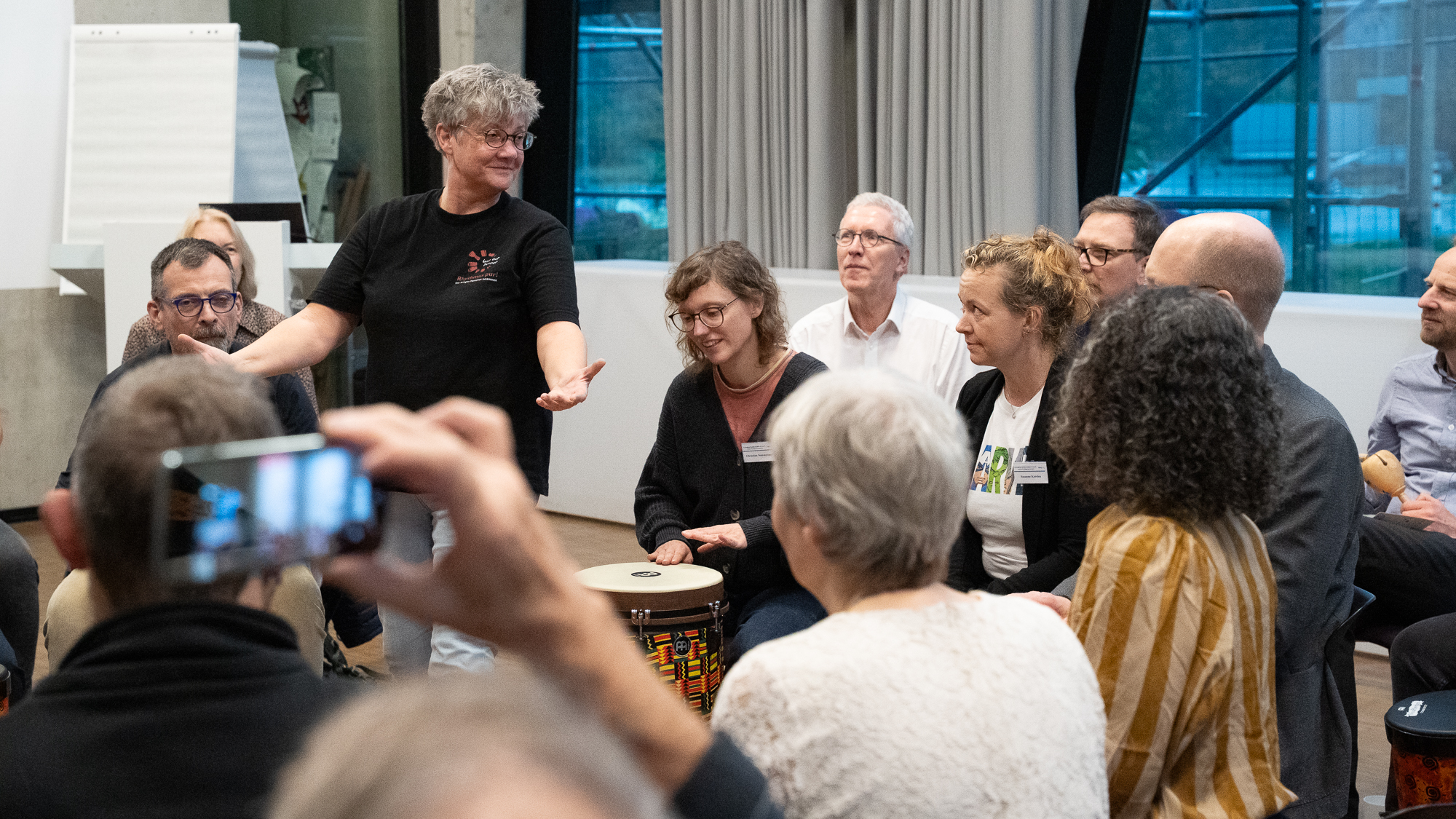 Familienmedizin ist interdisziplinär und lebt vom Wissensaustausch – Schwarmintelligenz statt isoliertem Expertenwissen. Begegnung, Dialog und das Zusammenspiel von kognitivem Wissen und Erfahrungslernen prägten den Kongress. Dazu trugen bewegende Gespräche (unter fröhlich grünen Regenschirmen) ebenso bei wie ein gemeinsamer Drum Circle – der Kongress hat nicht getanzt, aber getrommelt! Unser Dank geht an Ricada Raabe (Drum-Circle-Facilitatorin), die den Teilnehmenden ermöglichte, die verbindende und salutogene Wirkung gemeinsamen Trommelns zu erfahren!